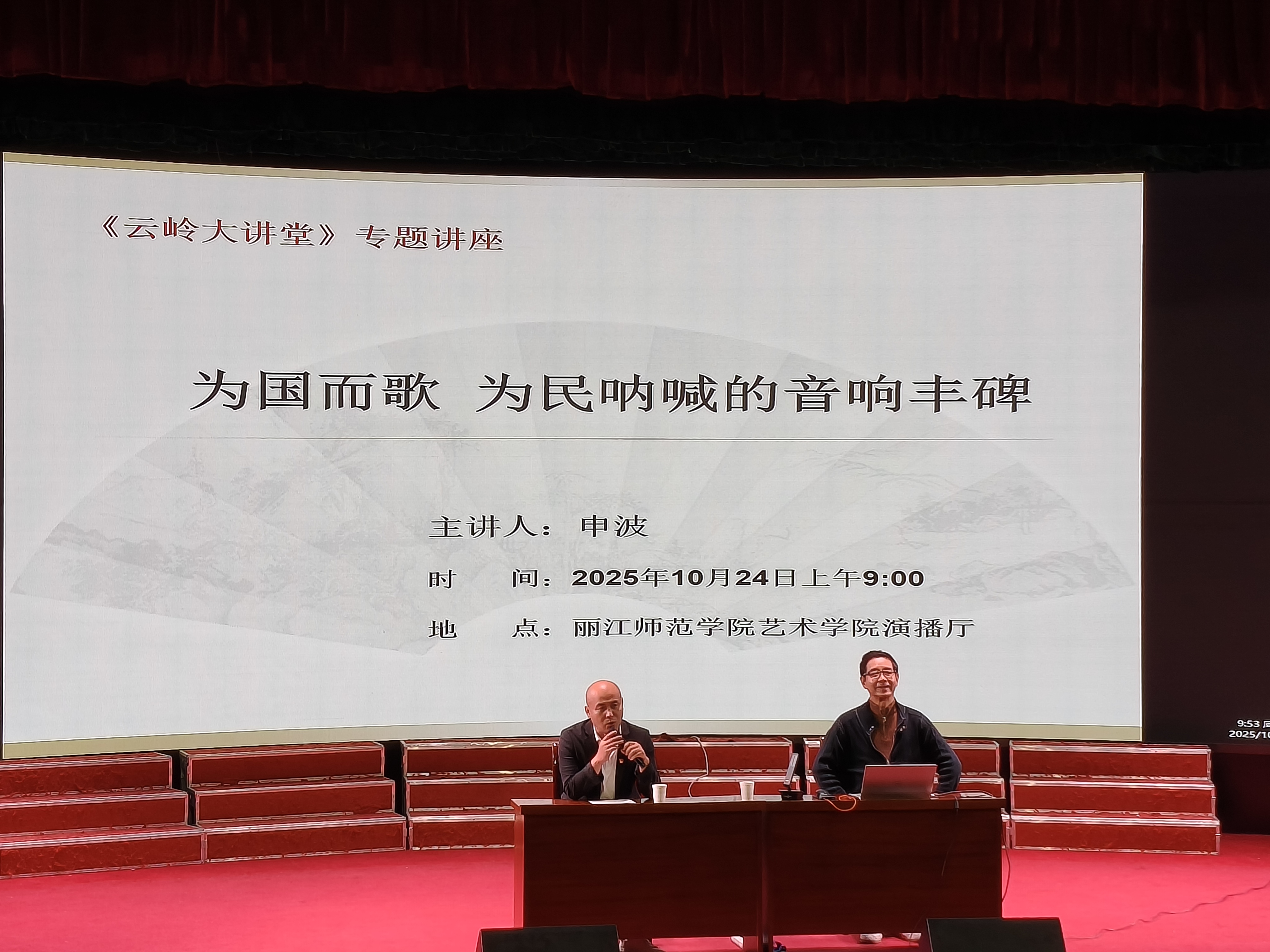 2025年10月24日上午9:00,《云岭大讲堂》专题讲座“为国而歌 为民呐喊的音响丰碑”在丽江师范学院艺术学院演播厅顺利开展。本次活动由丽江师范学院承办,旨在通过解析红色音乐作品,深化师生对爱国主义艺术精神的理解与传承。