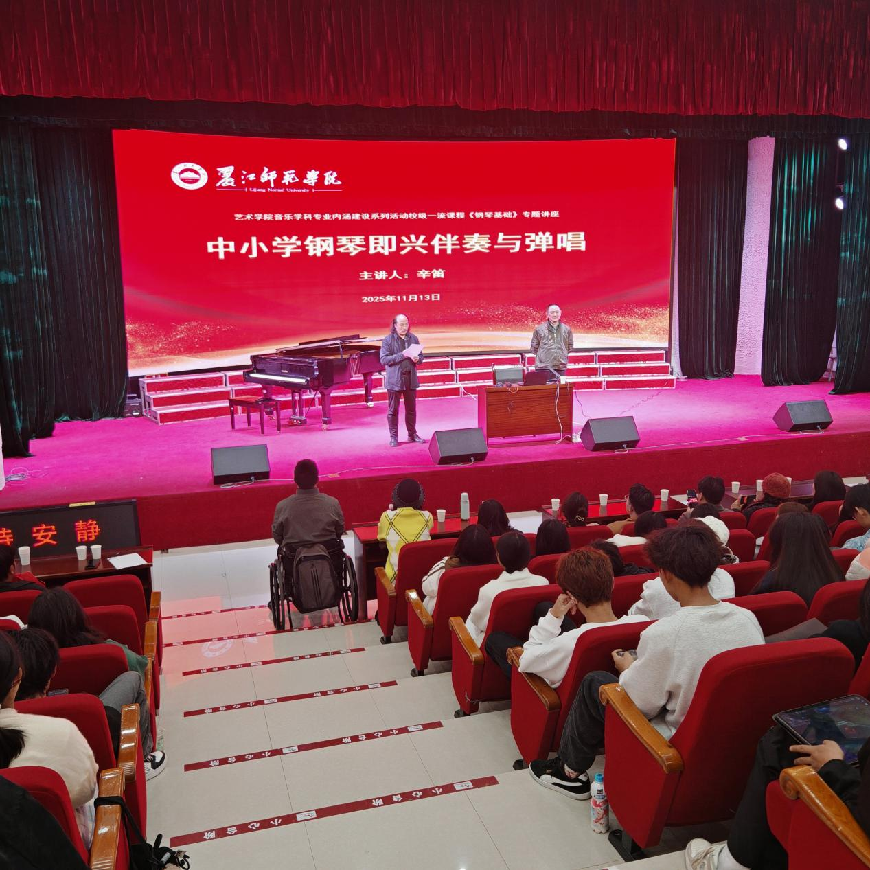 2025年11月13日,丽江师范学院艺术学院成功举办了以“中小学钢琴即兴伴奏与弹唱”为主题的专题讲座。本次讲座特邀“辛笛应用钢琴教学法”创始人、原星海音乐学院音乐教育学院院长辛笛教授担任主讲,为师生带来了一场关于钢琴教育创新与实践的学术盛宴。